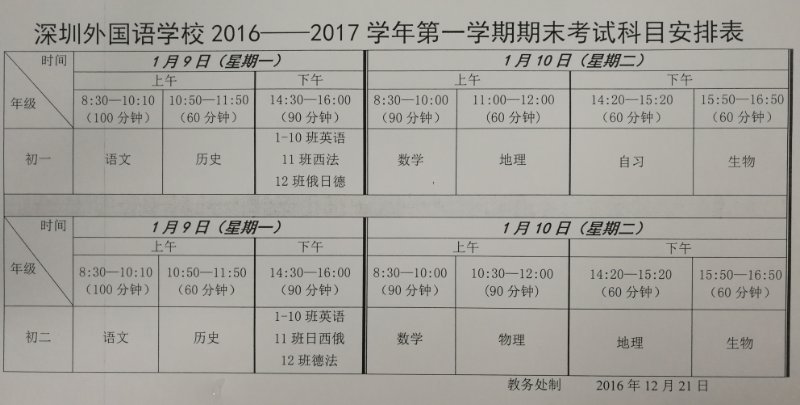深圳外国语学校2016-2017学年第一学期期末考试科目安排