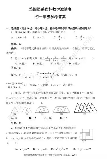 2017年第四届深圳鹏程杯数学初一组试题及答案