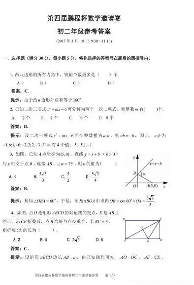 2017年第四届深圳鹏程杯数学初二组试题及答案
