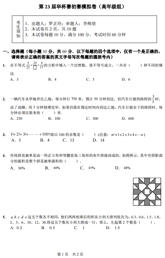 2018年第23届深圳华杯赛初赛小高组模拟试题