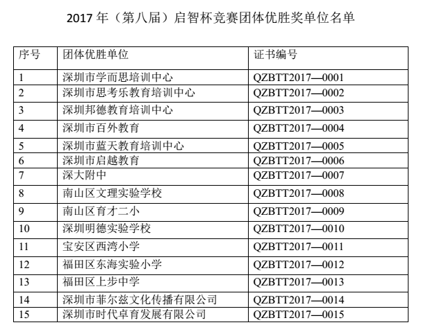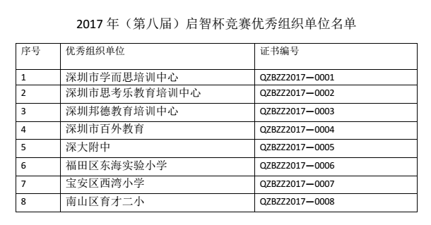 经过两周的筹备,2017 年(第八届)启智杯颁奖典礼的各项工作已经准备就绪,定于 2017 年 12 月 24 日(星期日)下午 2:00——5:30 在福田区深圳市福田区特区报业大厦礼堂举行。典礼上将对获得特等和一等奖的学生颁发奖牌和证书;对优秀组织奖、团体优胜奖的单位颁发奖牌;对部分优秀教练员颁发证书;现场发放各单位获得的全部奖项证书。