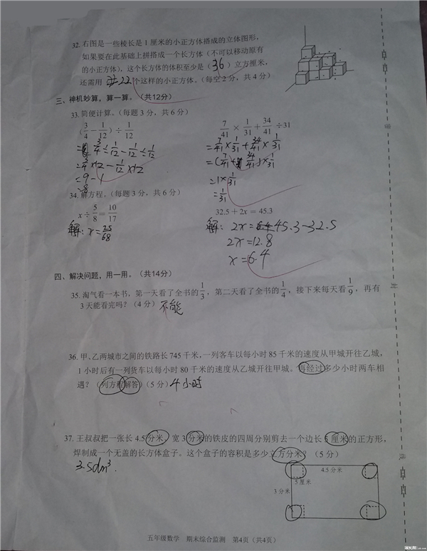 2017-2018年深圳龙岗区五年级期末数学试卷(4)
