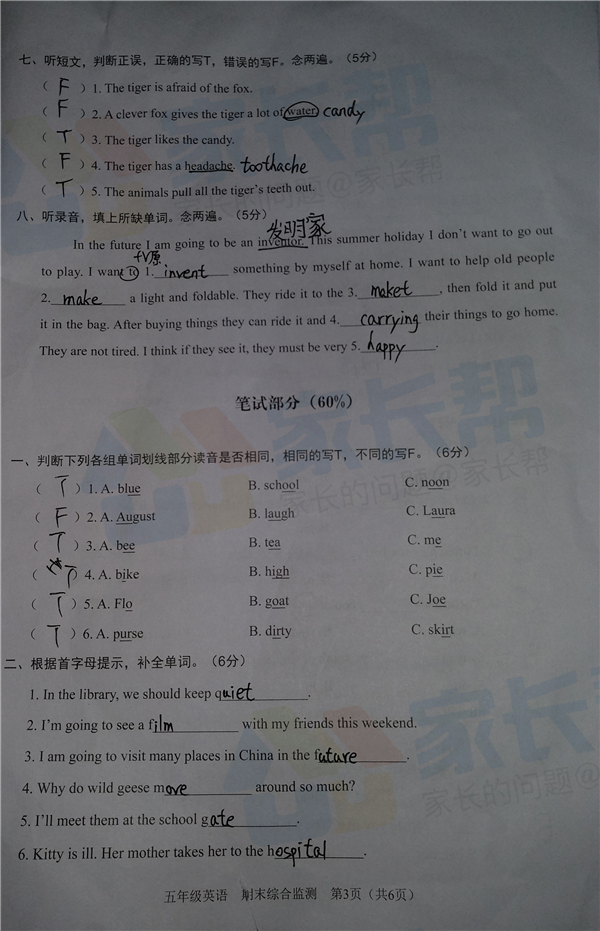 2017-2018年深圳龙岗区五年级期末英语试卷(3)
