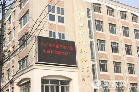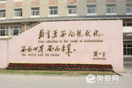 进入校园,浓浓的学习气息扑面而来,正对面是学校的前广场和新世纪科教楼,绿草漫漫楼舍巍巍,广场中央屹立着周恩来总理的塑像,像座的训言为:“外语要从娃娃抓起”,右侧为学生宿舍(食堂),食堂前的楼梯壁上,邓小平同志题字:“教育要面向现代化,面向世界,面向未来”。