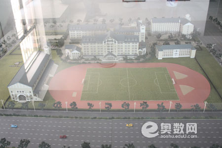 我们了解到,学校建筑面积约5万平米,大家从模型图上可以看到,整个校园成长方形,布局合理,规格整齐,右侧大门的两侧是宿舍楼(食堂)与小外培训中心,而从操场正面看去,依次是报告厅(操场左侧)、高中部教学楼(正对操场)、科教楼与初中部。