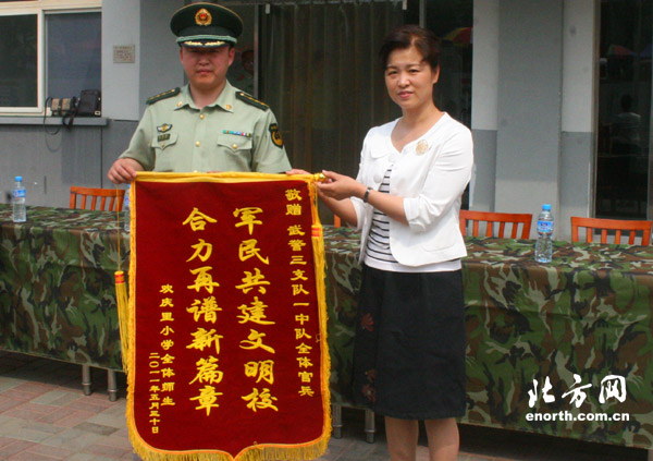 欢庆里小学校长陈虹向天津武警三支队一中队赠锦旗