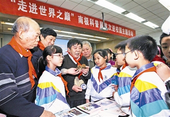 南极地衣、南极石、南极纪念章、南极剪报等由72岁的市民王洪生历时28年精心收集的珍贵物品,也让同学们看得如醉如痴。“科普展给了我们与南极‘零距离’的机会,太难得了。”5年7班的齐佳媛边看边记录,“我会学好本领,争取将来也在神秘的南极大陆留下自己的足迹。”