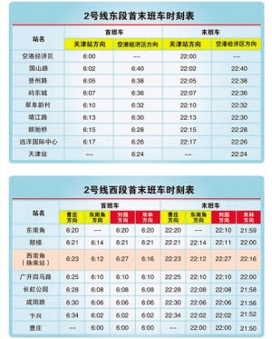 9月2日起,地铁2号线正式启用新版运行图,调整之后,2号线东段(天津站—空港站)首末班车时间为6:00至22:45,每日安排5组列车上线运行,全天开行192列次。平均行车间隔为8-10分钟。2号线西段(曹庄站—东南角站)每日行车时间为6:00至22:37,每日安排4组列车上线运行,平均行车间隔为9-10分钟,全天开行184列次。其中,天津站首末班车时间为6:24和22:24,东南角站首末班车时间为6:20和22:20。