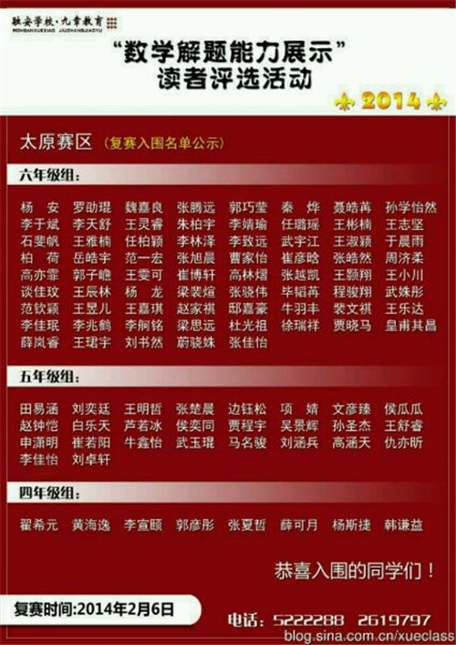 太原奥数网 2014年数学解题能力展示(迎春杯)太原进入复赛的名单公布了,看到很多熟悉的孩子名字,先恭喜入围的小伙伴们,希望复赛再接再厉,取得优异成绩: