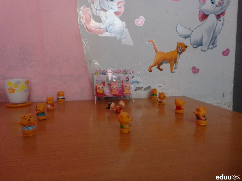 桌子上的维尼熊,让愣愣好想拿回家呢,墙上还贴着可爱的动物插画