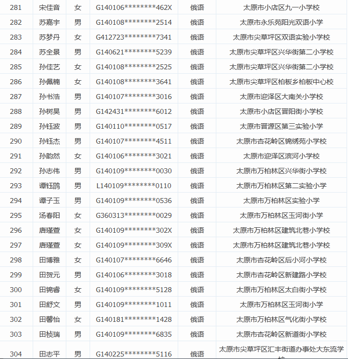 2015太原外国语小升初俄语志愿报名名单公示(13)