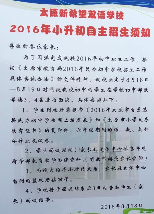 3.学校名称及开户行:太原新希望双语学校,开户行:上海浦东发展银行太原丽华苑支行,账号:68100154900000094。