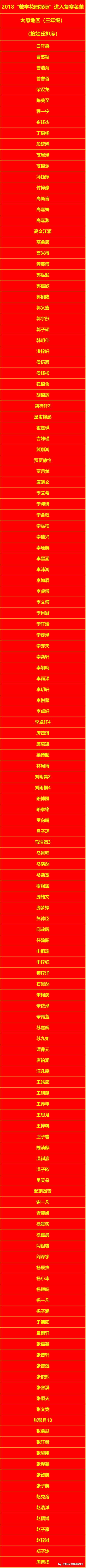 2018太原数学花园探秘(迎春杯)三年级复赛入围名单