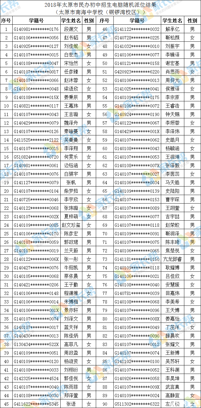 2018年太原市电脑随机派位结果:南海中学(铜锣湾校区)