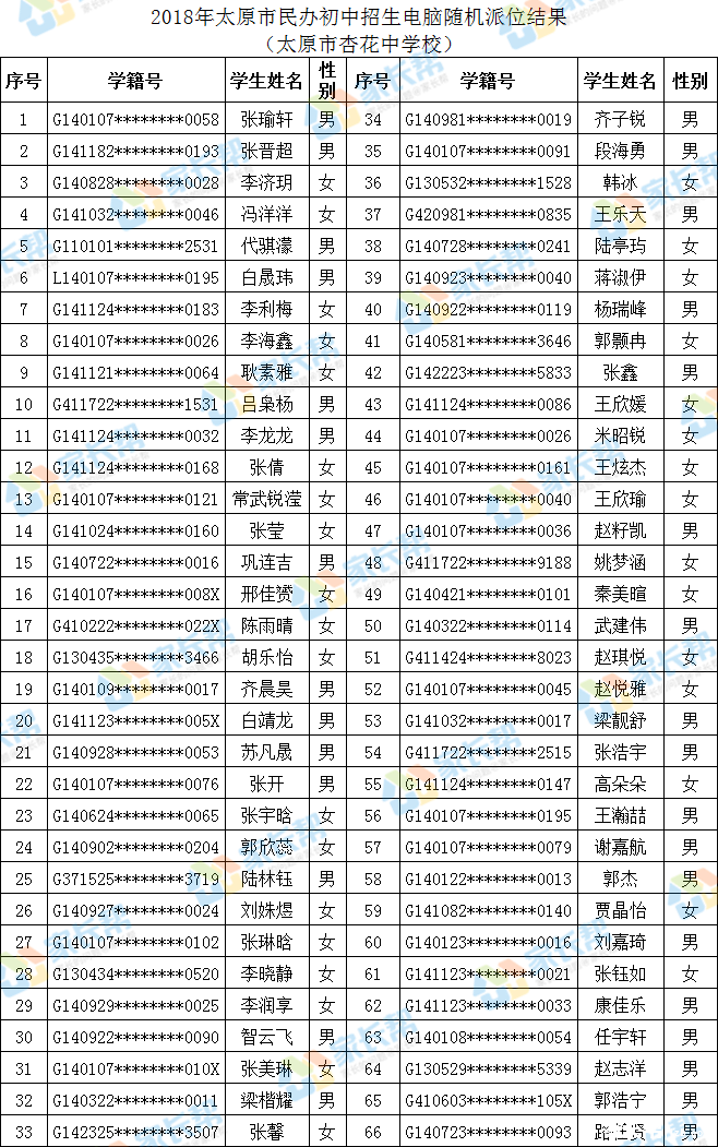 2018年太原市电脑随机派位结果:杏花中学