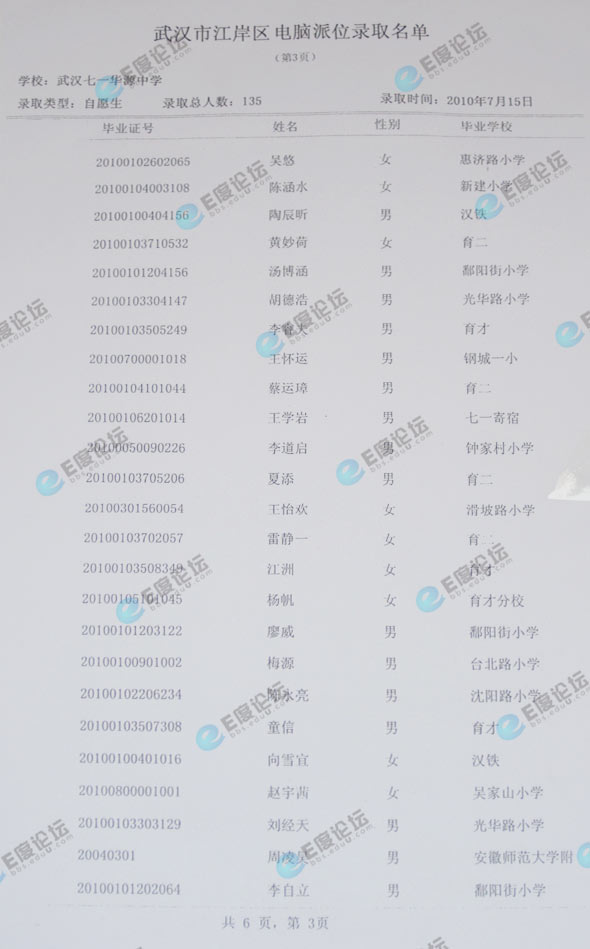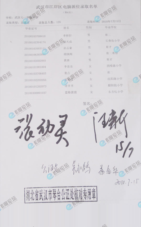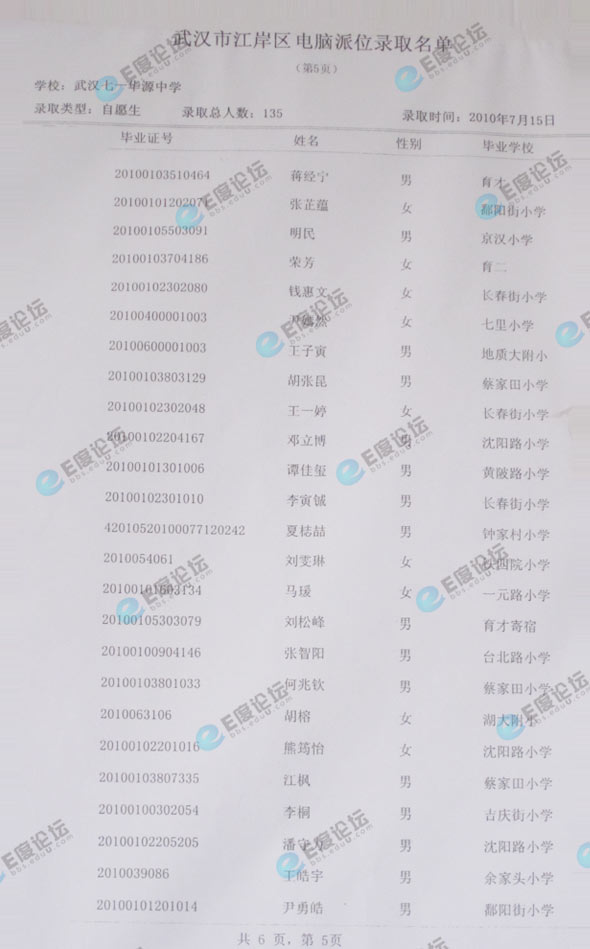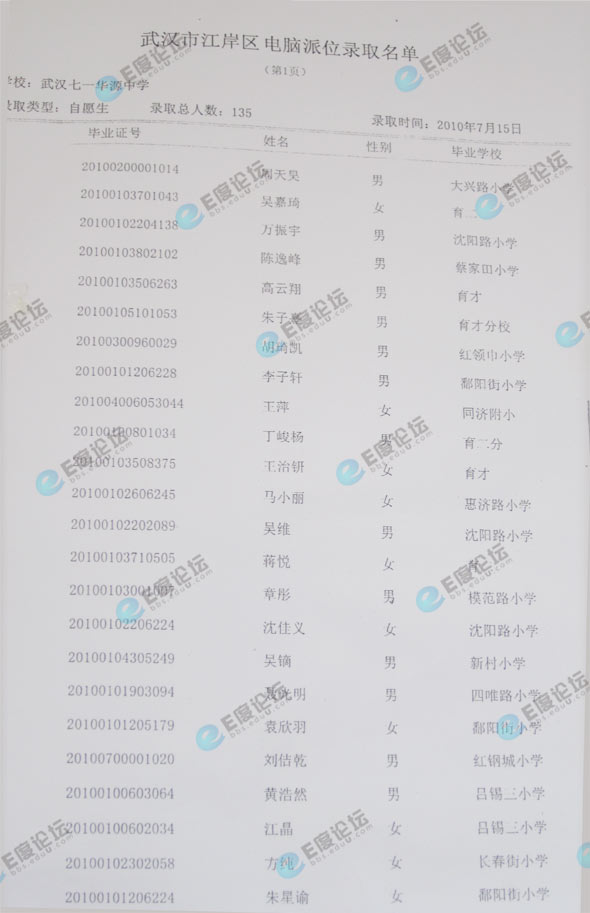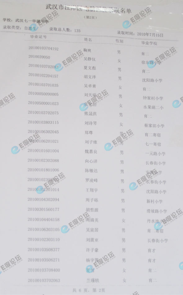 武汉市七一华源中学择校录取名单