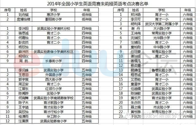 有家长表示图片上没有分数,附上茱莉亚英语(花桥)的电话,查分去咯~027-82600903【查看原帖并参与讨论:2014全国小学生英语竞赛(necps)决赛名单出炉啦(朱】