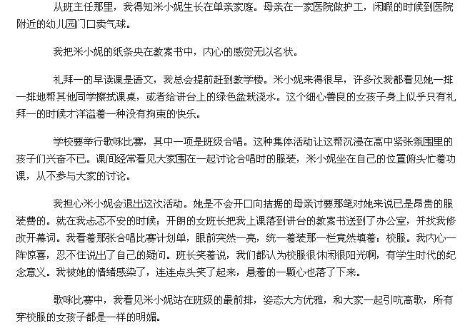 围观了长报等多家主流媒体在5.20登载的第30届楚才杯特等奖作文选登后,昨天,论坛里细心的家长发现其中一篇作品《恍然大悟》与《青年文摘》上2011年发表的文章《飞在教室上空的米妮》主人公、情节、文字描述非常雷同,甚至连姓名和“卖气球维生”的细节都如出一辙。晚上回家提起此事,孩子竟然也说做过这篇原文阅读练习!