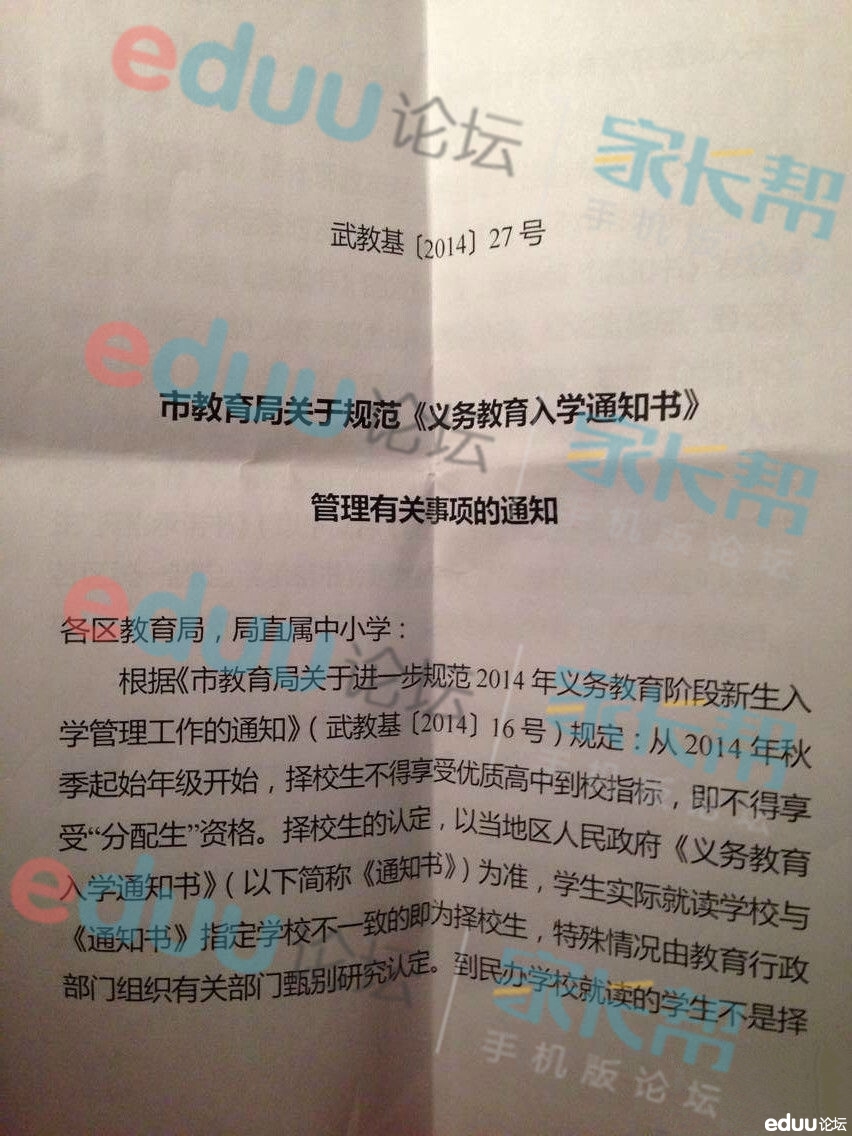 2014武汉市教育局关于《义务教育入学通知书》有关事项通知