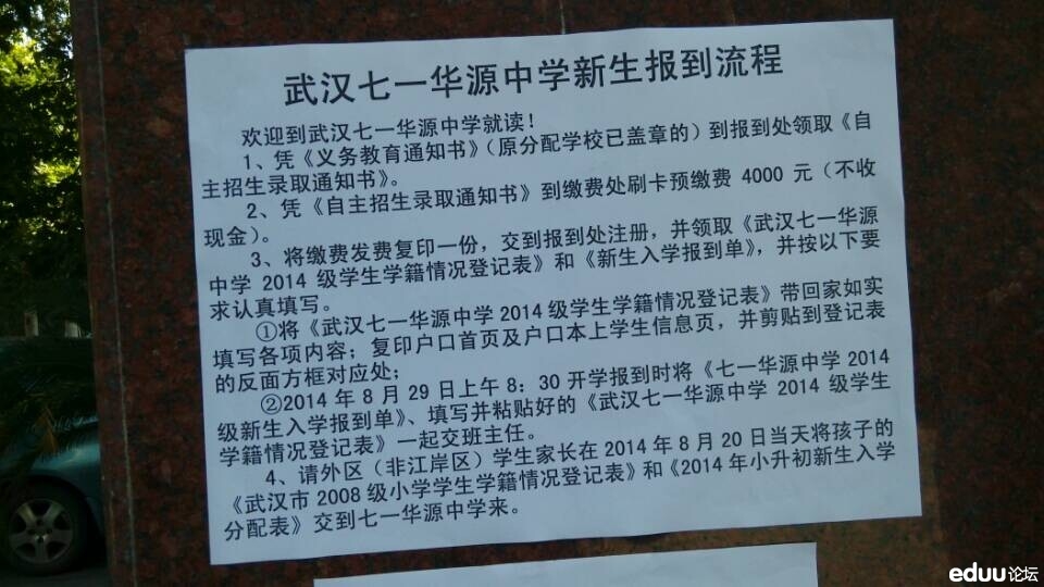 武汉奥数网 武汉七一华源中学公布了2014年小升初新生报到流程,以下为热心家长分享的七一华源相关信息。