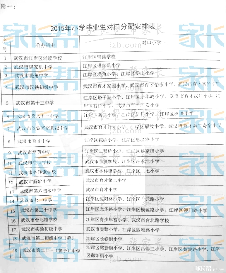 武汉江岸区2015小升初对口出炉