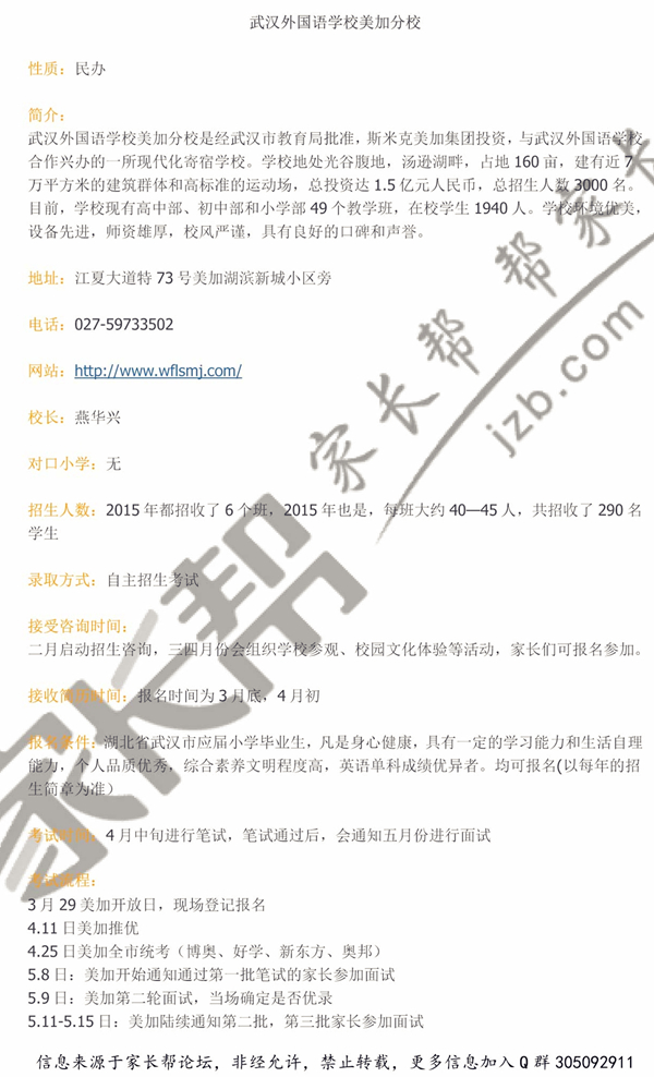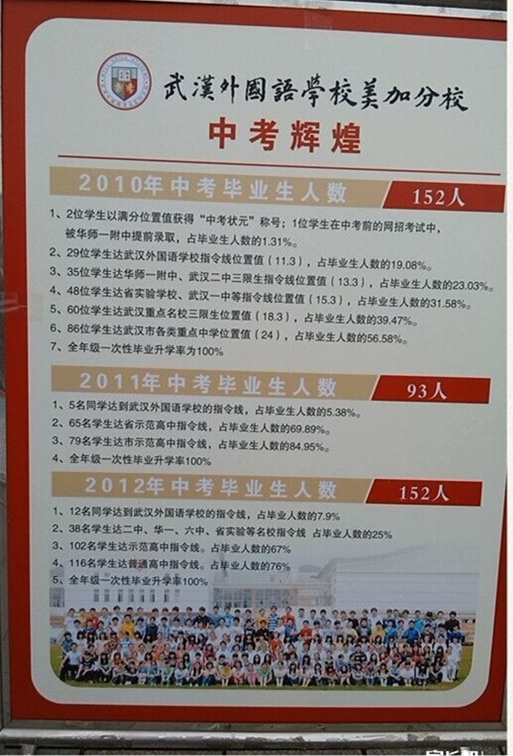 【导语】经过上半学期的学习,小六年级的孩子学习水平也渐渐显露出来,这时候进行择校对比是非常重要的,看看自己离期望中的学校是越来越近,还是越来越远,大家一定要根据自己的情况去进行择校。小编为了方便大家更准确择校,分享一些学校的详细信息,以供参考。下面是武汉外国语学校分校美加学校的一些情况。