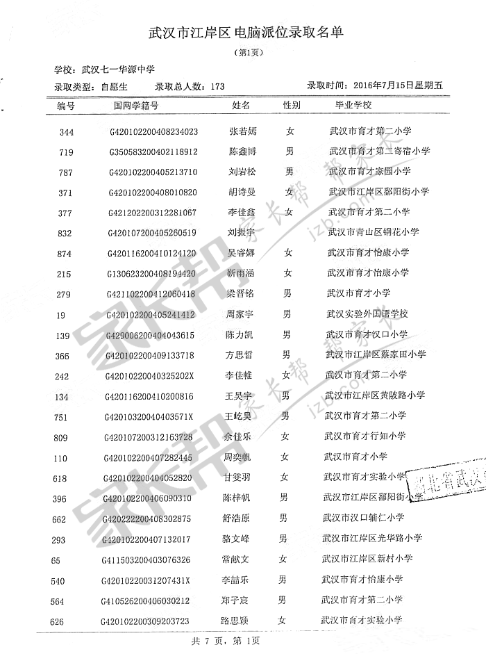 2016武汉七一华源小升初摇号录取名单