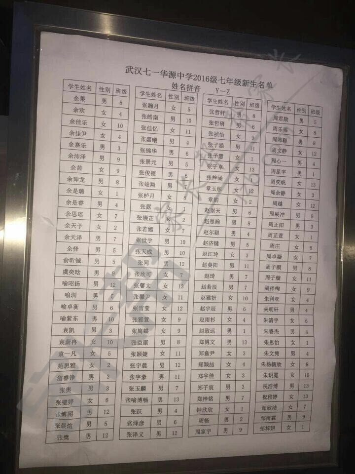 2016武汉七一华源新初一分班名单公示(6)