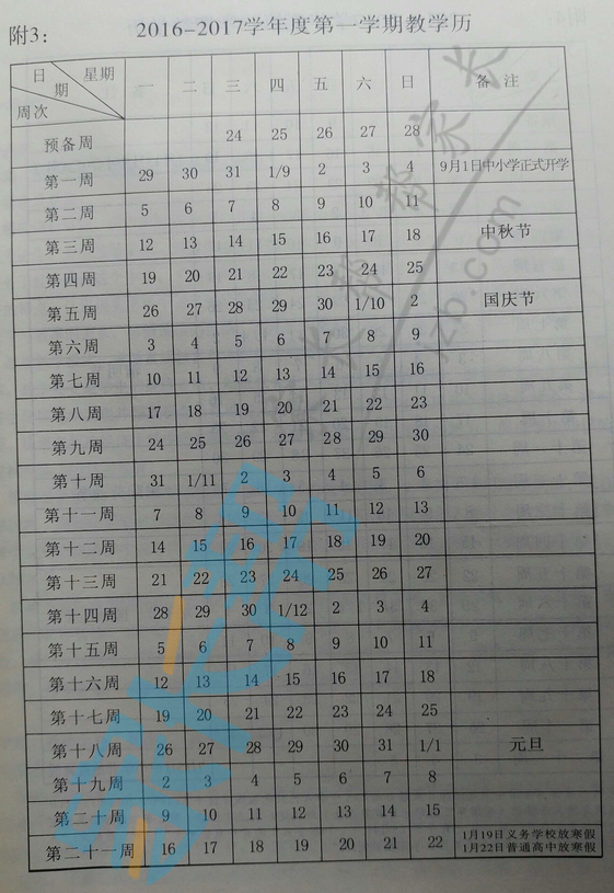武汉市2016—2017学年度教学历(含放寒假、暑假时间)