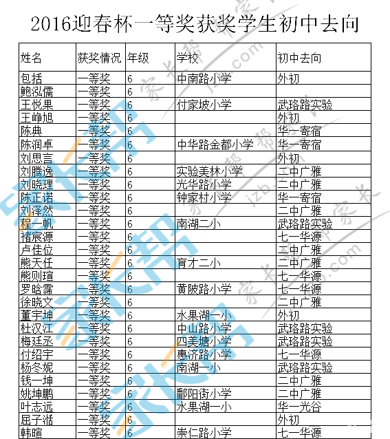 下面是2016年迎春杯的获奖名单,上面标注了就读的小学和初中的去向。迎春杯引进武汉不久,今年才对外开放,虽然参加的人数不多,但胜在其题目新颖、难度大,非常具有辨识度,所以能获得迎春杯一等奖的孩子都是比较优秀的,而这样的孩子在其他奥数类杯赛上的成绩也差不到哪去,另外从他们初中的去向来看也能很好的说明。