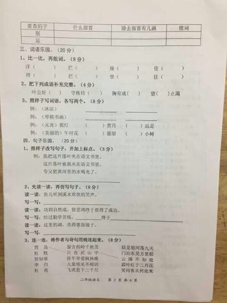 2016-2017学年上学期武汉东新区二年级语文期末试卷(2)