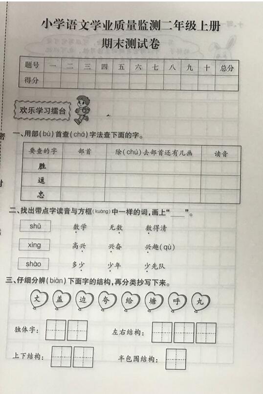 2016-2017学年上学期武汉江汉区二年级语文期末试卷