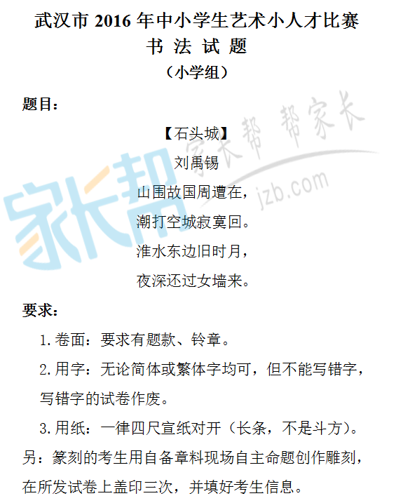 2016武汉中小学生艺术小人才比赛书法试题(小学组)