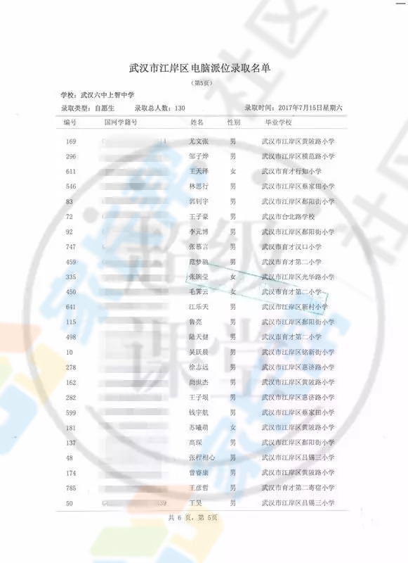 2017年武汉六中上智中学小升初摇号录取名单(5)