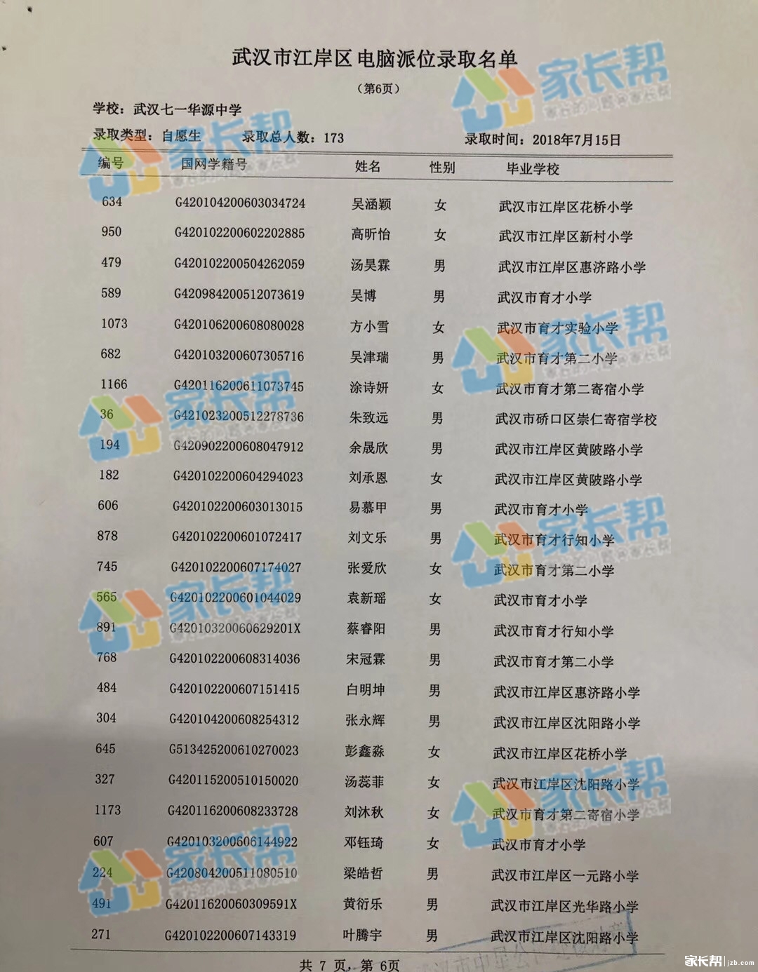 2018年武汉七一华源初中摇号名单(6)
