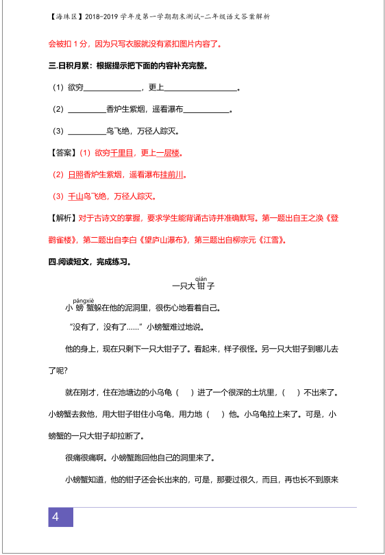 2019年武汉市小学二年级语文期末模拟卷一(图片版)(4)