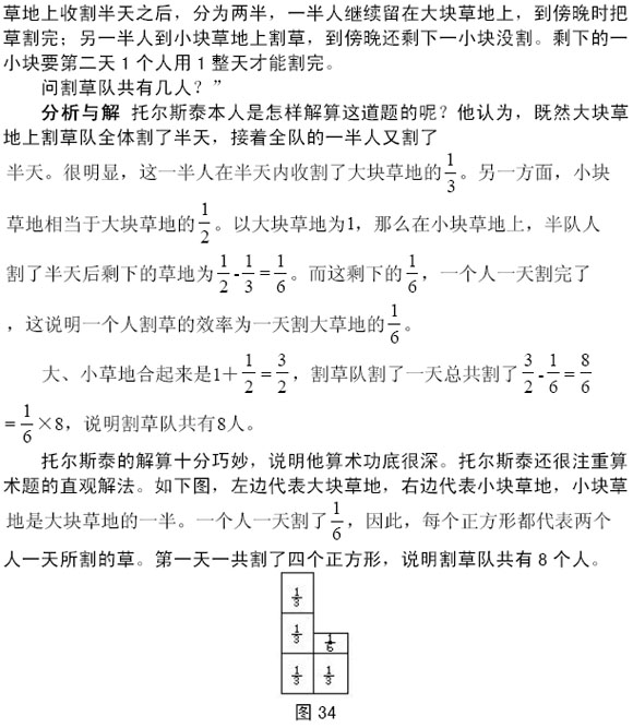 下面就是托尔斯泰非常喜欢的“割草人”算题:“一队割草人要收割两块草地,其中一块比另一块大1 倍。全队在大块