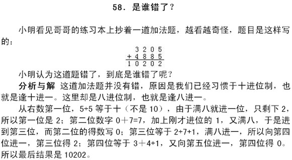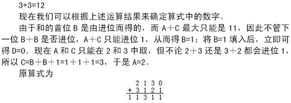 分析与解 十进制数中的1、2、4、8、16、32、64、128、256 分别是二进制数1、10、100、1000、10000、100000、1000000、10000000、100000000,这九个二进制数码可以组成1到(111111111)2的任何一个二进制数。于是用1、2、4、8、16、32、64、128、256这九个十进制数中的数相加,可以得到1到511中的任何一个十进制的数。所以保管员在九个盒子中分别装入1、2、4、8、……、256 发子弹共511发,剩下的489发装在第十个盒子里。如果需要的子弹数小于或等于511发,那么就可以由前九个盒子中挑选出若干盒子来满足。如果需要的子弹数大于511发,那么可先取第十盒中的489发子弹,其余的由前九盒中的若干盒来满足。