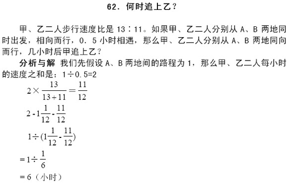 分析与解 甲从十字路口南1350米处往北直行,乙从十字路口处向东直行,同时出发,10分钟后二人离十字路口距离相等,说明甲、乙二人10分钟共行了1350米,于是可以求出二人每分钟的速度和。又知道,二人继续行走80分钟,即从出发各行90分钟,二人离十字路口距离又相等,说明甲、乙二人90分钟行走的路程之差是1350米。于是又可以求出二人每分钟的速度差,进而求出甲、乙各自的速度。