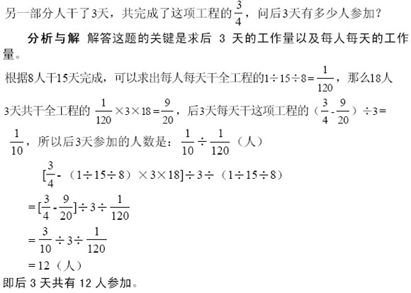 说明:题中给出“完成这件工程前后共用了6天”,既不表示甲独做了6天,也不表示乙独做了6天,而这6天中既包括甲独做的天数,也包括乙独做的天数,因此,解答时应该用“假设法”去求解,正像分析中所说的那样,“假设完成全工程所用的6天都由乙独做”,然后求出甲独做的天数。