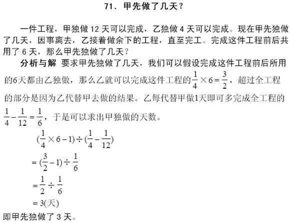 当然也可以“假设完成全工程所用的6天都由甲独做”,然后求出乙独做的天数,再从6天中减去乙独做的天数,就得出了甲独做的天数。