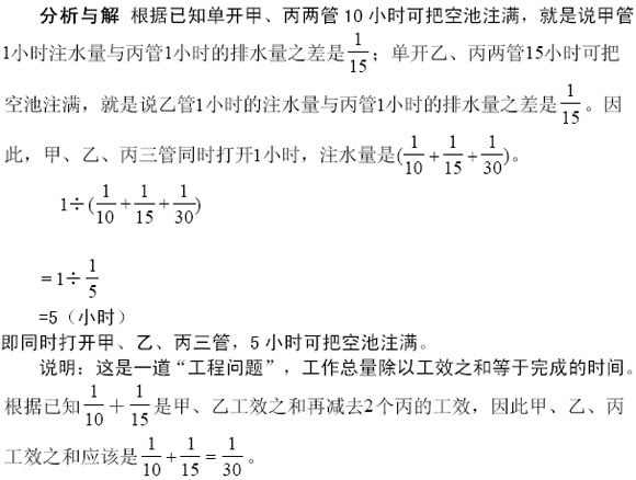 一个水池有两个进水管甲、乙,一个排水管丙。如果单开甲、丙两管,那么10小时可把空池注满;如果单开乙、丙两管,那么15 小时可把空池注满;如果单开丙管,那么30小时可把满池水放光。现在同时打开甲、乙、丙三管,几小时可把空池注满?