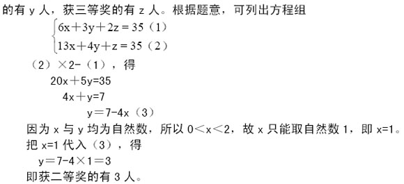 分析与解 本题有三个未知数,可分别设获一等奖的有x人,获二等奖